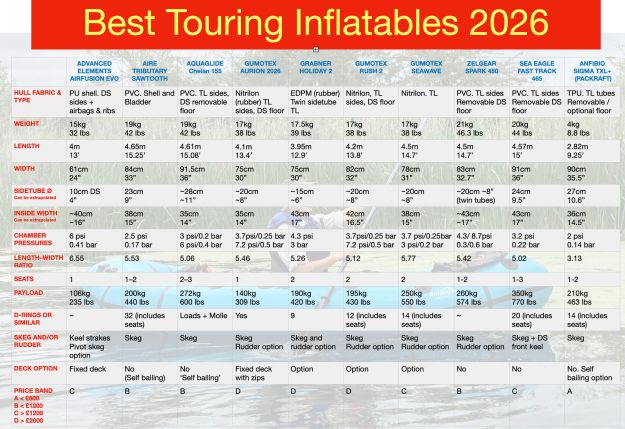 L is the first letter of the word light, too. The boat on Yves’ head above weighs just 11kg, and that’s made from tough Nitrilon suited to whitewater rafts. My Seawave with newer lighter Nitrilon weighed just 16kg once I ditched the original seats. That can be just about be managed alone under arm or on the shoulders between a car and the water, or of course checked in as airline baggage. The best touring IKs with room for up to two people need not weigh more than 18kg or 40lbs. See table below.