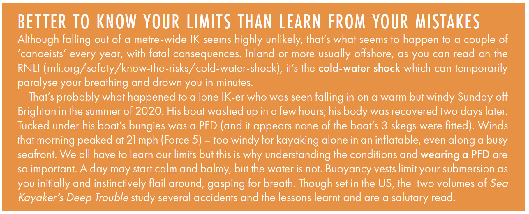 is for an IK’s disadvantages over hardshells and folders. These include some 20% less speed over a same-sized hardshell, and up to a point, less control in white water and rough seas when things get very technical, although see thigh straps.