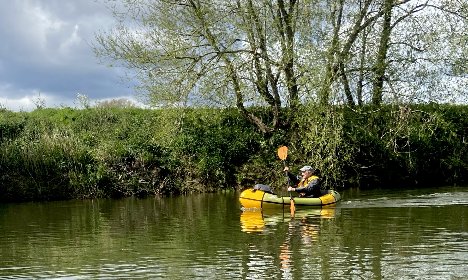 Differences with the prototype include no frontal skeg. Shame, I would have liked to try that properly to see if it reduced yawing at a possible cost to quick turning. I mention in Do You Need a Skeg that the now widely copied Alpacka Extended Stern from 2011 helped reduce the yawing of my previous Denali Llama (first generation Alpacka) by positioning the paddler more centrally, (like a kayak) to reducing the pivoting effect. But now I think about it, it’s the asymmetric, upturned white-water-riding bow of a typical Alpacka which may lead to flatwater yawing. To be honest over two days on the Wye without the skeg fitted, I didn’t notice any untoward bow-yawing once the knack of packraft paddling had been reacquired.
