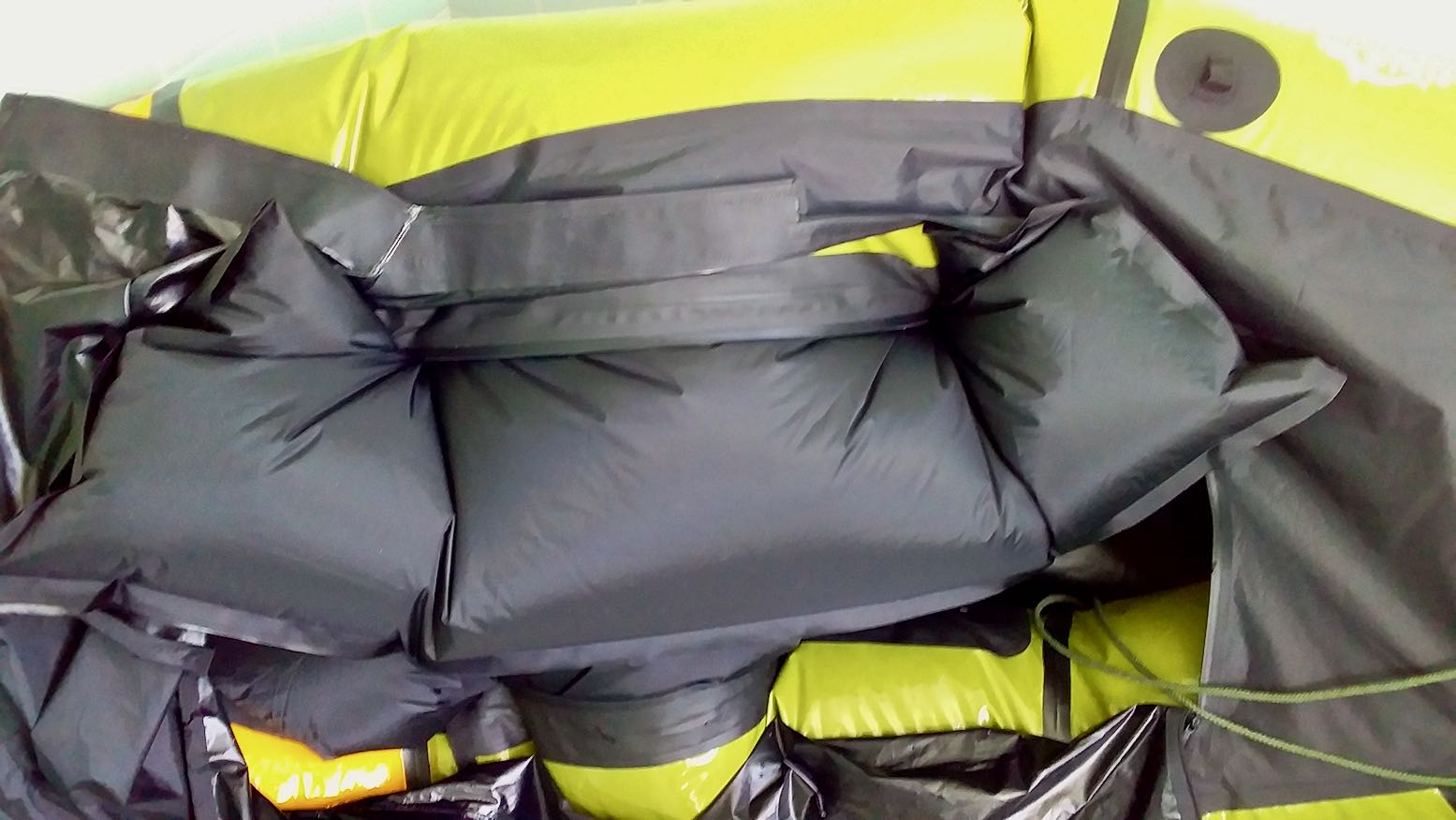 Anfibio’s Tube Bag system is more like a huge IPX7 zip pocket in each side tube and separate from the hull chamber. You pack them, then zip up leaving a small gap so excess air can escape. Inflate the boat in the usual way; as you do this air is squeezed out of the pockets and all the contents gets pressure-sealed in place; no need for internal straps. Smart. You then close the tube zip right up and off you go (the zips are still quite stiff). Warnings remind you not to open the zips when inflated; do so and the contents will be expelled by the hull pressure, your boat will sag and it’ll be virtually impossible to put it all back in without going ashore. But that’s no different to not being able to access a Cargo Zip-type set up.