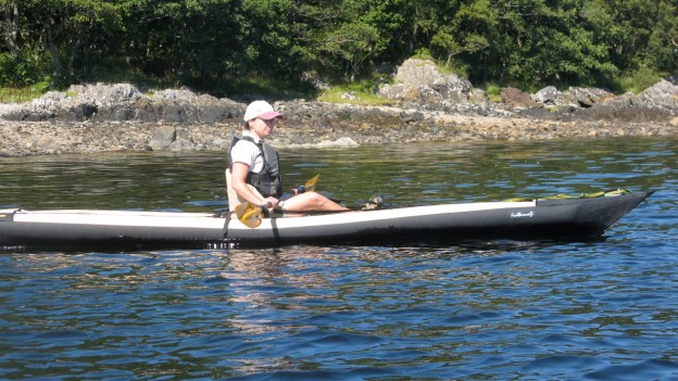 The Java kayak didn’t really feel right to me: the old problem of too narrow and me sitting too high for my weight. An experienced hardsheller would probably not have any issues. We went on to a freshwater loch, a little windier by now. I tried to visualise myself in a fairly normal one-metre swell out at sea. The rocks I added for ballast hadn’t really added an impression of stability (as they can do on other tippy IKs) and overall, with the height/width relationship I didn’t feel confident anticipating the less than flat calm conditions I wanted to be able to face.