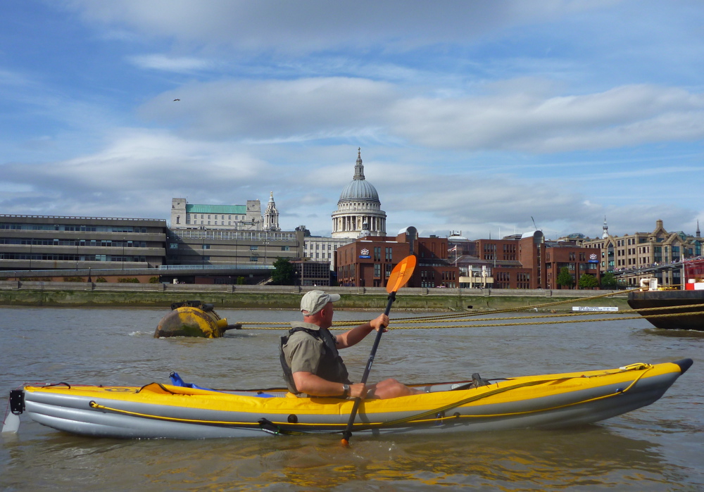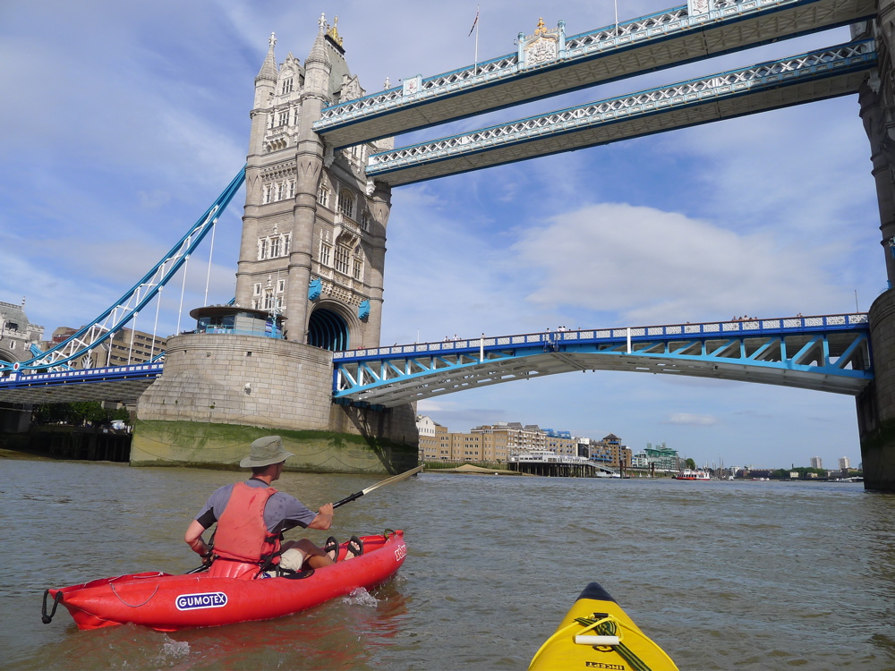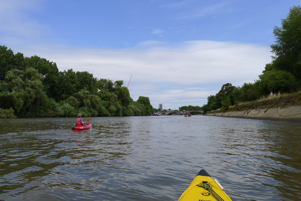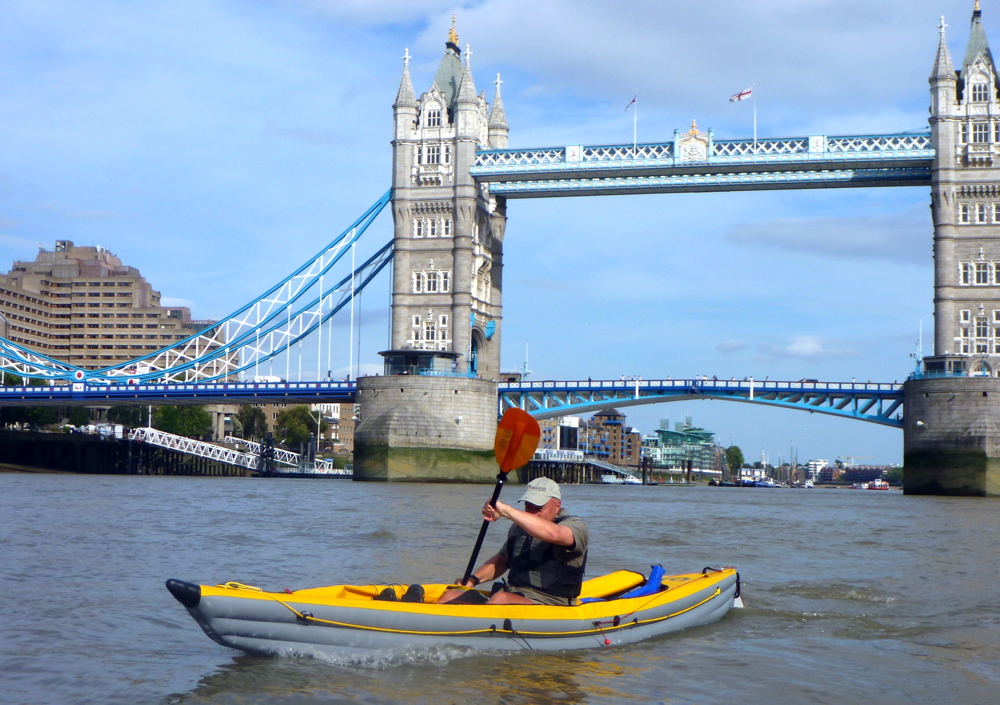 The river meandered south putting us into the wind, but it was good to crank up some solid effort. Even here the odd Greenwich-bound tour boat still threw out their mini tsunamis which crashed with a roar along the banks behind us and were fun to negotiate up to the point where you thought, ‘ooo-er, hold on a minute, am I’m surfing here!?’ Otherwise, the broad river gets a bit dull along this section and soon enough the wooded hill of Greenwich Observatory and the prime meridian peeped out from behind a bend. Steve was a bit pooped for spinning the ill-fitting Solar along at Incept speeds. And having used my huge Werner Corry paddle, I too was suffering from some elbowitis. We came ashore by the Cutty Sark tea clipper, lifted the boats carefully over the broken glass and gravel, up over a fence, aired down and headed for the station. We did this 21-mile run on a neapish tide of just 3.8m – they drop to 3.5m and rise to 5m this time of year at Richmond (it’s about a metre more at London Bridge). That took us only 4 hours actual paddling which must be the fastest 20 miles I’ve ever done in a paddle boat. Slowed down by locks, inland of Richmond the freshwater Thames can be a bit boring, but I wouldn’t fancy coming through Westminster at the height of an ebbing spring tide on a busy summer’s day with a backwind. At such times it’s probably not a place for total beginners in tippy hardshells, but as long as you’re ready to get stuck in, it is of course good fun and you can be sure of a big audience. Just make sure you clip on a Go Pro to catch the action! The tidal Thames starts at Teddington Lock, about three miles upriver from Richmond. You need to time Richmond Lock just downstream of the Twickenham Bridge (A316) correctly, 10 minutes downstream from our put-in at Water Lane. I did not notice it as it’s flooded at HW when it’s just another bridge. It’s actually a barrage to hold water upriver around Richmond once the tide turns. There’s a roller pass for kayaks on the left, if you find it closed.