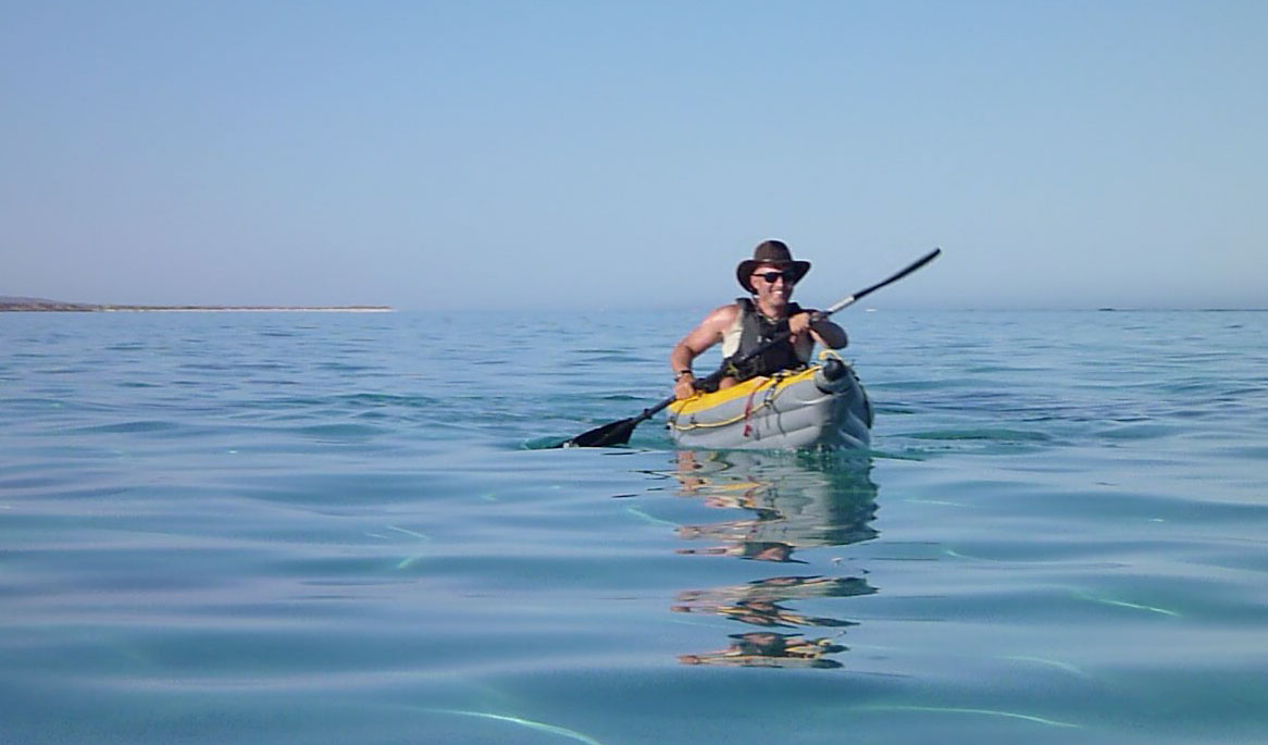 Another spell of wading brought us finally to Tantabiddi boat ramp by which time I’d divined a new paddling technique probably known to all: pushing off the mushy inflatable’s footrests actually enabled a rigid torso rotation which notably increased speed for little extra effort. With energy to spare after only a day or two’s paddling, at times I was even inching past the tandem until we nudged ashore at the ramp. Jeff and Sharon performed a ‘paddle high five’ after completing their challenging 150-km run up from Coral Bay, most of it alone.