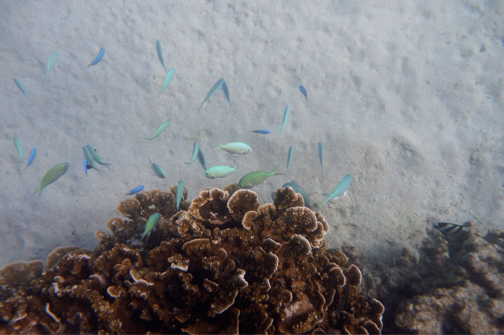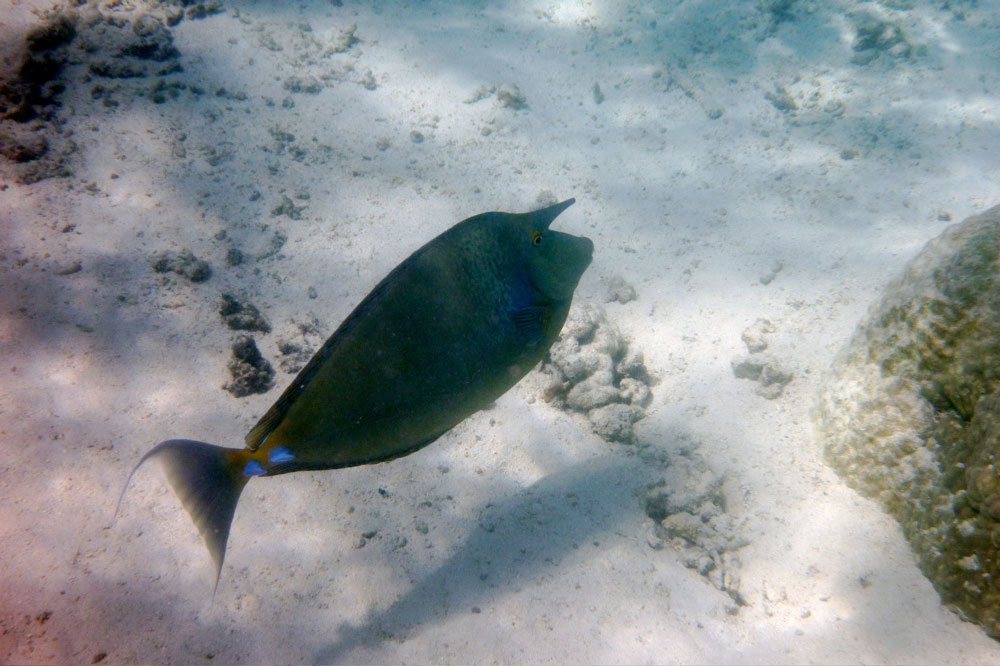 Early next morning we got the break we were hoping for: near still conditions. After forensically tidying up the camp, we headed out towards the surf line and finally had a chance to enjoy a little of what we’d come here for: gliding serenely over the reef just a few feet below, past fishes, sharks, turtles and rays. No need for a mask or glass-bottomed boat today, it was all laid out below us for an hour and a half until the north winds returned us to business as usual.