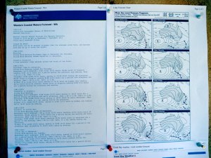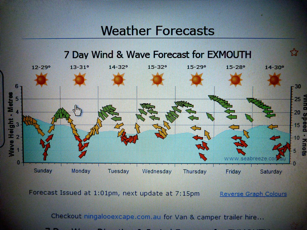 Following weather reports over the preceding weeks I was beginning to wonder if September (early spring) such a good time after all. Asking around, many said a month earlier (as we’d been at Shark Bay) would have been fine – or May, or in high summer between cyclones. Everyone had their own suggestions, but the fact was right now the forecast for the next week (left) was 20 to 30-knot winds from the east or southeast, with gusts half as much again. As a result all fishing and tourist boat charters were cancelled out of Coral Bay.