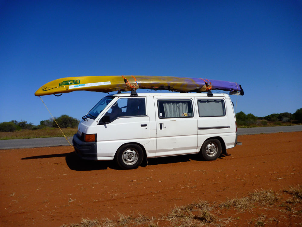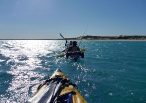 We loaded the boats on the shore, set off and flicked up our Pacific Action V-sails. Behind us, a curious crowd of early morning dog walkers had gathered while I struggled to follow a straight line across windy Batemans Bay (‘Coral Bay’). The sea was flat enough but the Incept seemed hard to control as the sail flapped or swayed violently from side to side. I tried to imitate the sail position Jeff was running on his big tandem, but soon even he reckoned it was already too windy to use the sails, so we pulled them in and paddled around Point Maud into the big scoop of coastline that leads north some 60km to Point Cloates below the Ningaloo sheep station.