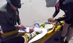 By the late afternoon it was clear that after nearly a week at sea, Jeff and Sharon didn’t have the puff to make it to our pre-ordained camp in the portly tandem, so we pulled in on a beach for a much more satisfying wild camp and a great feed laid on by Sharon from a food cache we’d retrieved earlier in the day. To avert any alarm or searches we left a phone message with the head ranger. As the fire died down we dozed off at 8pm and the wind dropped off, promising a good night’s sleep. Its howling was replaced by the distant roar of surf breaking over the reef.