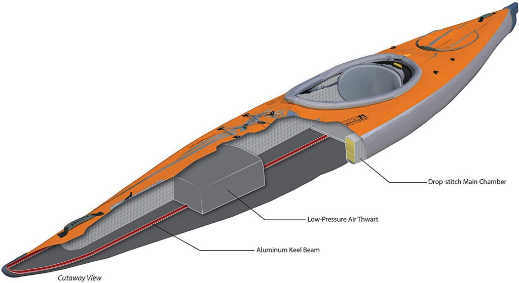 At 24 inches wide this is also one of the narrowest IKs around, similar to Itiwit’s 25-inch X500. That means it should also be fast, but the X500 is known to be tippy (it’s worse for larger paddlers). You’d think the AirFusion might be the same, but without an inflatable floor you sit a few inches lower (as in a hardshell kayak) which greatly aids stability. Certainly online reviews don’t mention the AirFusion’s tippiness as much as the X500 which runs 10psi I (Dropping the pressure a bit can improve things at the cost of performance.)