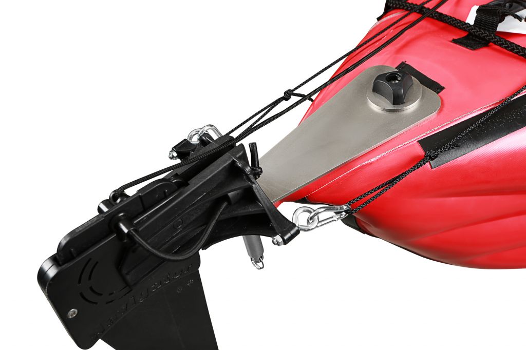 Footrest-pedal in solo position. Tape avoids wear on hullTakes 1 minute to reposition for tandem paddling