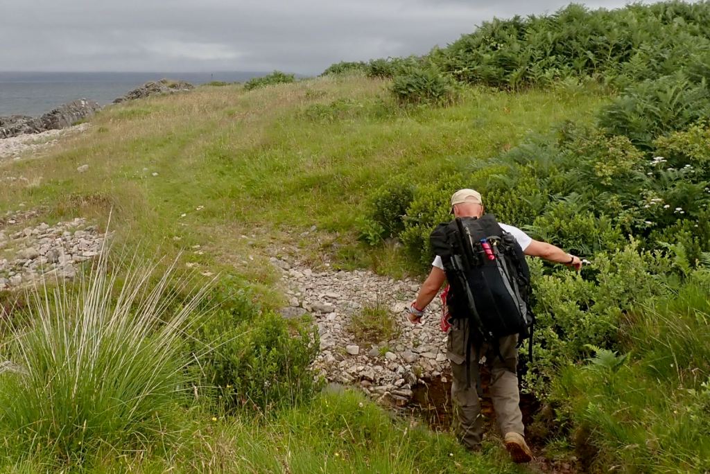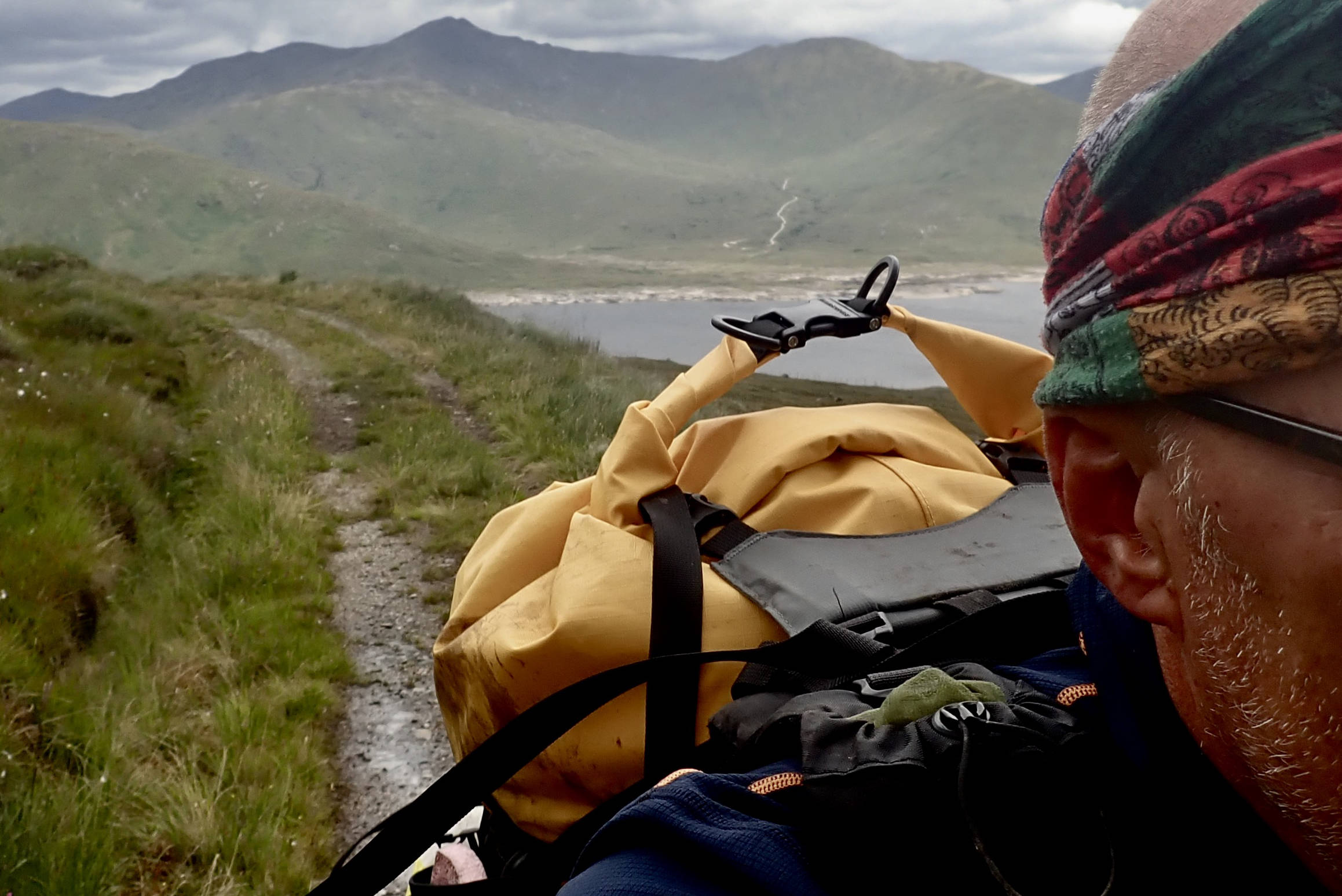 On the way back to the Inverie ferry I decided to take the packraft out of the UDB and strap it underneath (above), using the fitted straps for this purpose. Surprise, surprise, the lowered load carried much better. Hung outside and quite wide but out of sight. But the rolled-up boat is vulnerable to getting snagged on barbed wire fences, farm gate latches, or when being hauled about in transit.