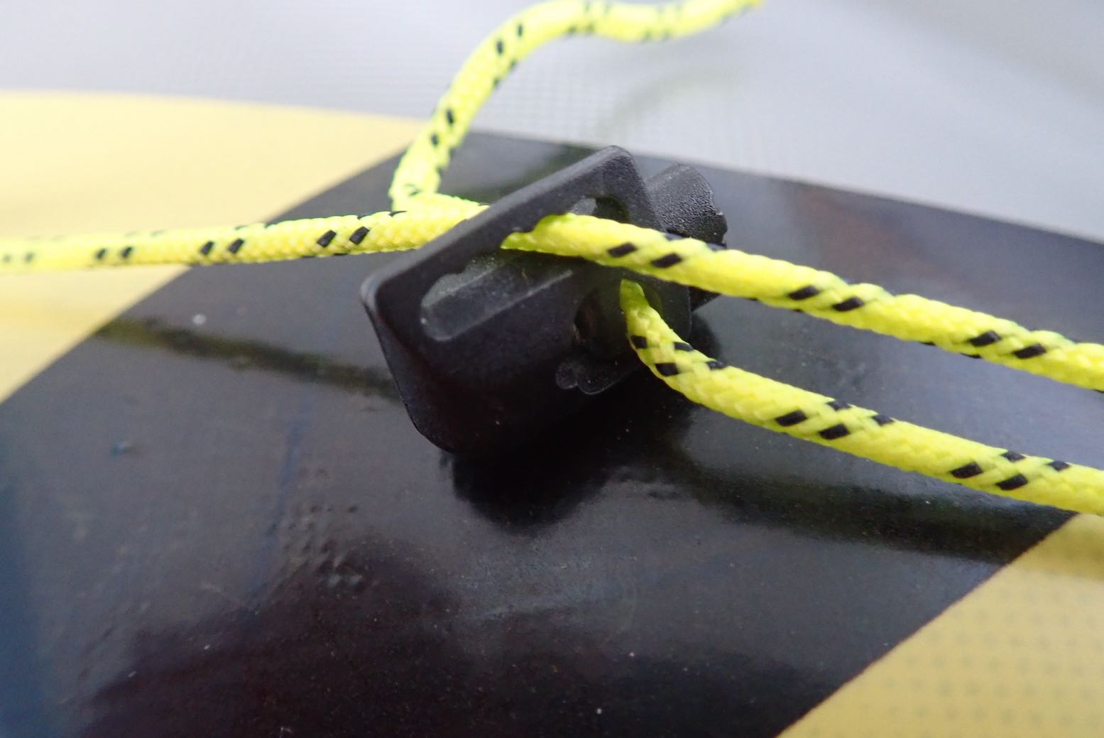 I stumbled on quite a fast and easy way to fine tune or readjust the footrest pedal tension: inline clam cleats (or cam cleats or rope locks) which I came across during my V-Sail experiments years ago. Feed the line through as shown below; centre both rudder and footrest, then cinch up and you should be good to go. Once you’ve established the right line length through the cleat for a certain fixed position, it can help to ‘memory mark‘ the cord (as I did in red). Though I bet once I get on the water and use the rudder a bit, they’ll go off alignment, so probably better to wait till then.