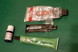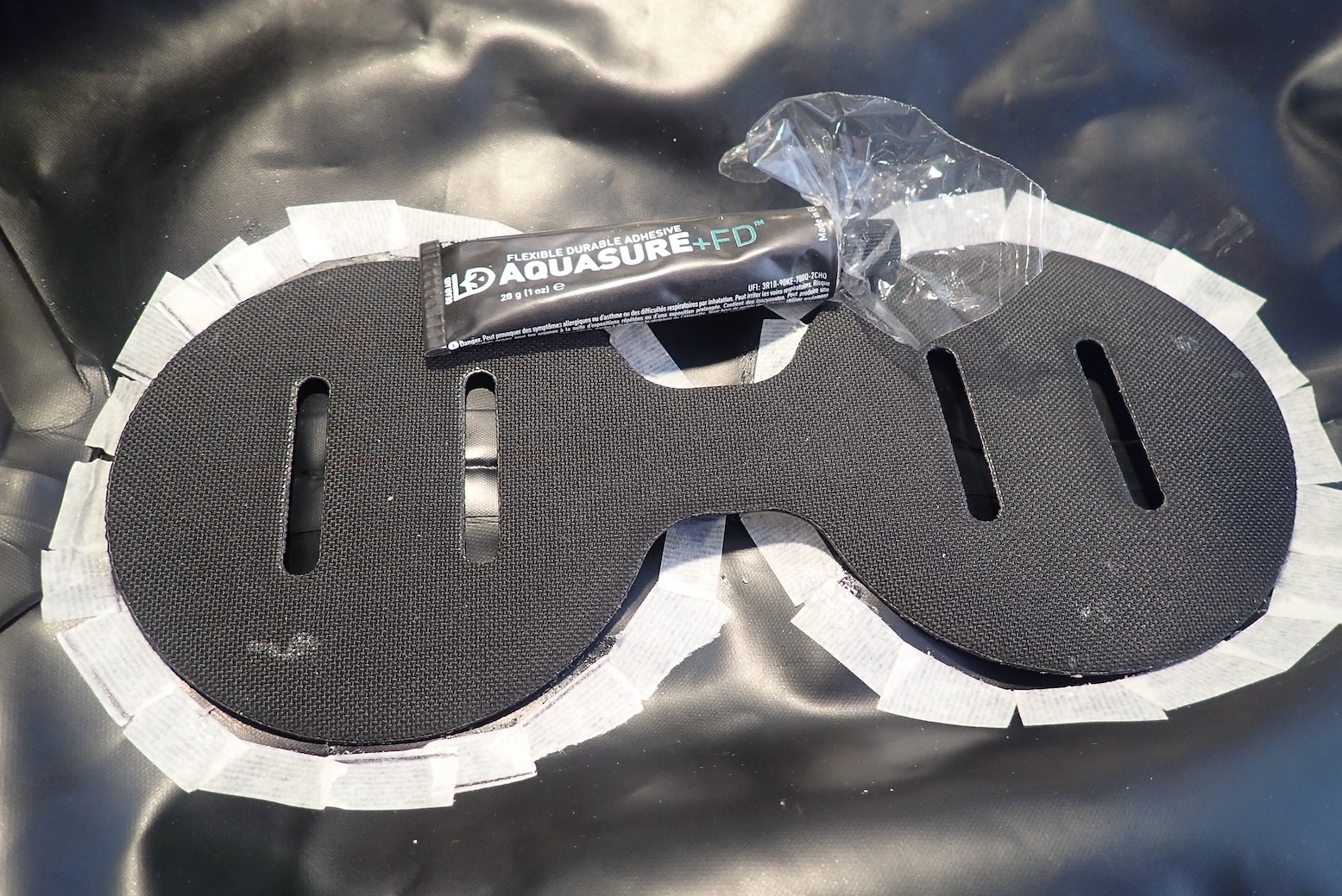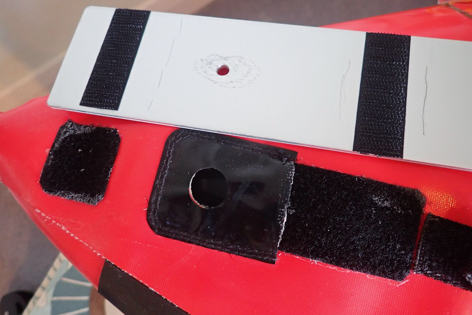 Rudder mountplate The 10mm red chopping board I bought was actually quite bendy (LDPE, not HDPE?) compared to other bits I realised I had all along. The less play in the rudder system the more responsive it will be; an IK’s stern mounting is mushy enough. This time round I copied Gumotex’s idea of using small velcro pads to stop the rudder twisting on it’s pivot-clamp axis. Initially lacking stick-on velcro, I glued plain velcro, using the PU glue from the Gumotex repair kit. For one-part glue, it seemed to fix the velcro pretty well but if not, some sticky-back came in the post.