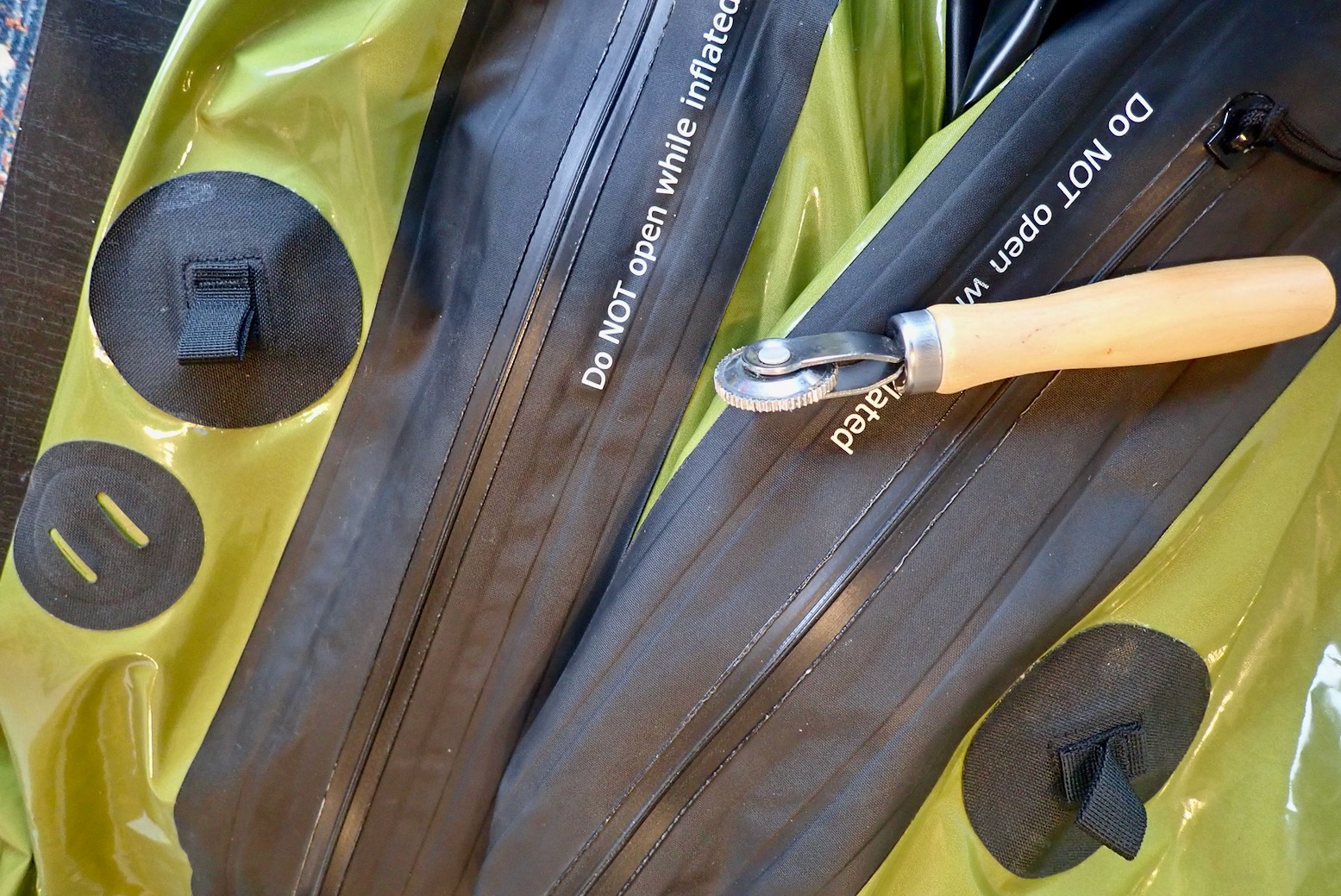 Anfibio don’t fully explain why they’re now offering thicker Plus(+) fabric; has the standard proved a bit less durable? I admit Anfibio do focus a bit too much on the ultra lightweight side of things which, alone in a single-skinned inflatable, is not where my priorities float. From my experience with stiffer PVC IKs versus more flexible rubber kayaks, I do wonder if a Plus(+) TXL or similar might be more rigid on the water without the need to pack it full of air. It may even exclude the need for the 900-g floor pad (it doesn’t). Along with what I estimate to be a <500g weight penalty, I imagine a Plus(+) TXL will roll up less compactly, but other than that it’s something worth looking into.