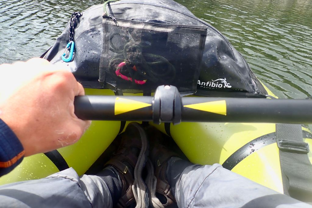There was no place to hop off and top up the boat, though I could always flip round in the seat and do it on the water. That said, I wonder if longer packrafts like TXLs could benefit from repositioning the inflation valve closer to the central seat, like my old Incept K40 solo IK. The MRS Nomad had the valve on the bow, which was handy. I suppose this might make expelling the air on rolling up more difficult, but we now have mini pumps with suction settings, making valve position less important. With a passenger or another paddler alongside, on-water topping up is less of an issue, but had I thought it through before adding the second skeg patch, I could have glued it at the other end, as the TXL is symmetrical, but then is the bow bag tabs would be at the back. So halfway down one side would be better, Anfibio. Sorry, I did I say something?
