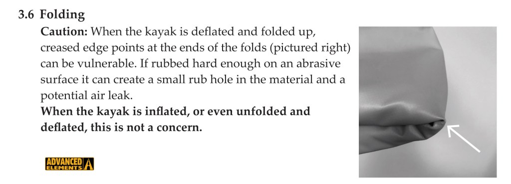 Synthetic rubbers like Nitrilon and EPDM are tough, durable and more expensive than PVC, metre for metre. On a same-sized boat, they’re also more pliant and will roll up much more compactly than PVC (left, a 4-metre Nitrilon Sunny). Importantly, this means creases and folds cannot develop into cracks and leaks, as I’ve found on PVC boats, and which the Decathlon X500 is said to suffer from, while hard folded corners (below) can be vulnerable to abrasion.