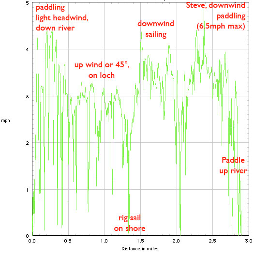 As before, I found a stiff headwind paddled into at 5kph (graph, left), didn’t correspond into a scintillating downwind glide under sail. Top speed was just over 10kph at which point things begin to get interesting and you want more. But most of the time Steve was able to keep up and even take pictures between paddling his Kahuna, so all I was gaining was some rest rather than extra speed.