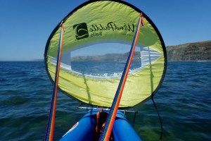 For the last few years I’ve settled on a 1.2-metre ø WindPaddle 2 Adventure sail with my IKs and packrafts. Prices dropped just before they stopped trading and you can see it’s worth paying for a composite batten (hoop) which won’t snap after a couple of weeks. On my Seawave it worked, but I decided the old problem of weathercocking (back end getting blown round) was down to a too small skeg or too short rudder. I fixed that with a long rudder on a Sussex coast paddle.