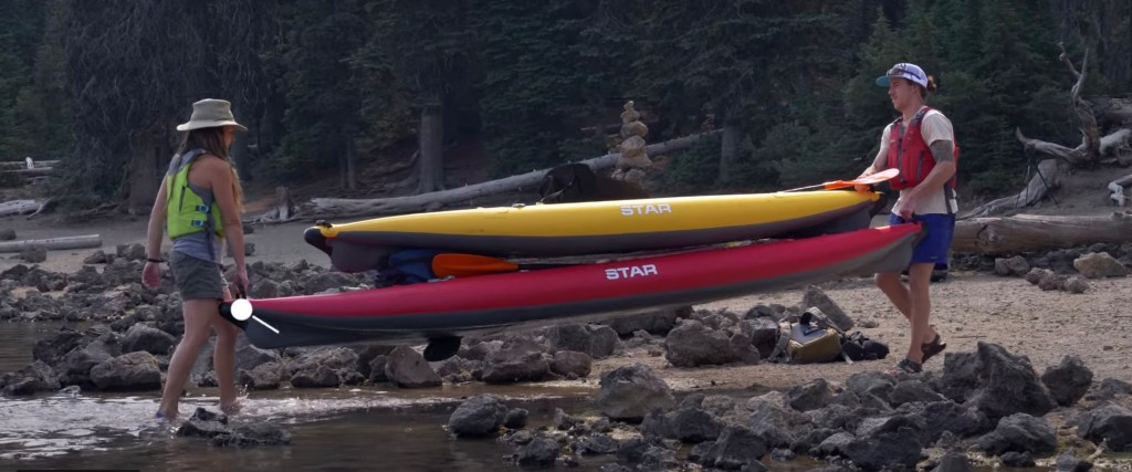 Some models are self-bailing; the Patagons are ‘displacement hulls’. The $1000 13.5 foot (4.1m) Star Paragon XL (left) could be worth a look. It’s 36″ wide and weighs 48lbs (91cm/ 21.7kg). The Paragon Tandem is 15 feet x 36″ but weighs 58.5lbs! (4.57m x 91cm; 26.5kg).
