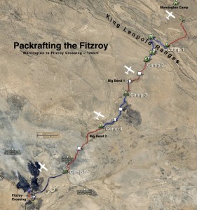 Emerging from the uplifted sandstone escarpments of the King Leopolds at lunchtime on the second day, we were having no such shortages. The preceding Wet had ended five months ago breaking all Kimberley records, and as we’d flown into Mornington a couple of days ago it was clear that, against our expectations, below us the Fitzroy was still flowing and four-fifths was open, paddleable water. There’d be a lot less walking than we’d anticipated.