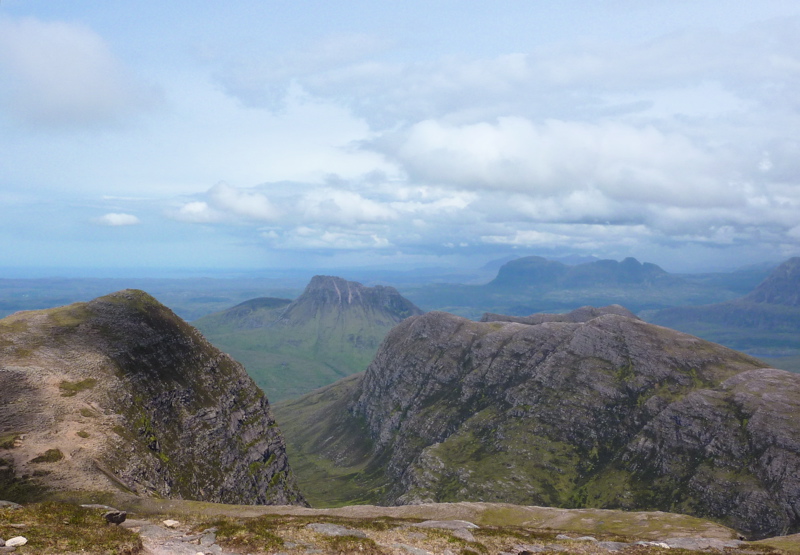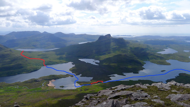 Below: almost the entire route seen from Cul Mor summit, looking southwest and west. Stac and Summer Isles in the distance.
