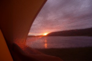 Squelching over a novel mixture of burned peat crust spongebog mush (left), at the pass I looked down and saw half a dozen tents and a couple of canoes (right, barely visible) pitched at a meander in the river at a point where it was quite probably fordable. I’m sure the water there was running eastwards from Fionn into Loch Veyatie [it doesn’t], but if that’s the case then Fionn Loch is unusual in that it drains both ways, east and also west via the River Kirkaig to Lochinver and the sea. A geographical oddity? who knows [I do now; it isn’t]. I walked directly to Fionn, deployed the Yak and paddled across the channel (left). A short walk out of sight of the campers found a flat shoreline where I pitched beneath the looming mass of Suilven.