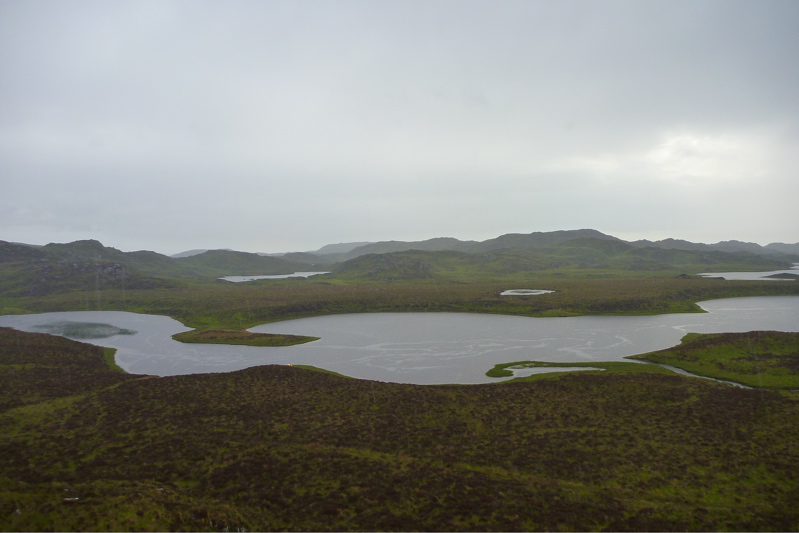 It would be nice to report a stirring vista some 400 metres below the summit of Suilven, but a leaden gloom pressed down on the sodden land. I’d called the Mrs – tomorrow would bring more rain, but the winds would return too first thing in the morning. Back in the tent and soon after sunset, the rain arrived early and lasted most of the night. It was all a bit much for my single-skin tent which, though amazingly light and compact, is not rated as waterproof. The drips soon came through the fabric of the flat roof as I dozed, soaking my legs and chilling me. Half-awake, I lay my cag over the drip zone, after which the night passed well enough and I woke reasonably dry. The next day was not one for shorts; today I was going to try out my new Kokatat Swift Dry Pants (see Suilven Gear). I’d half a mind to catch the twice-daily bus at 11.15 from the junction (see green graphic, top of the page) and estimated it would take 4 hours to get there, so breakfast at 6am was cereal in warmed up loch water. It wasn’t raining yet which meant it would be shortly, so I packed up quick and scooted back over Fionn Loch, taking a different route back southwest, past Na Tri Lochan to an inlet on Loch Sion (see satellite image bottom of the page). It was a longer land stage, but would put me into a better position to dodge the predicted southwesterlies while paddling back west towards Boat Bay. I’ve been reading a lot of sea kayaking literature lately and the lessons were paying off.