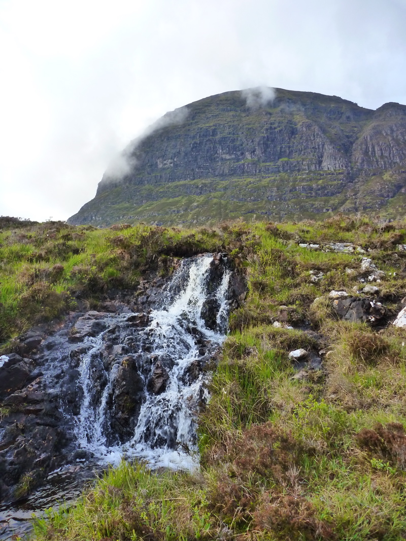 I set off northeast, passing other inviting but unnamed isles (left and right), around Rubha Sionascaig with its alluring isthmus and up to Creag Sionascaig. Arriving at the shore, new shoots of grass poked through the blackened peat, scorched by the bushfires of early May which have been well and truly doused by the series of lashing gales which followed. I rolled up and headed up a creek line towards a saddle, passing a ruined croft which, as in so many remote locales in northwest Scotland, makes you wonder what on earth the people lived off up here?