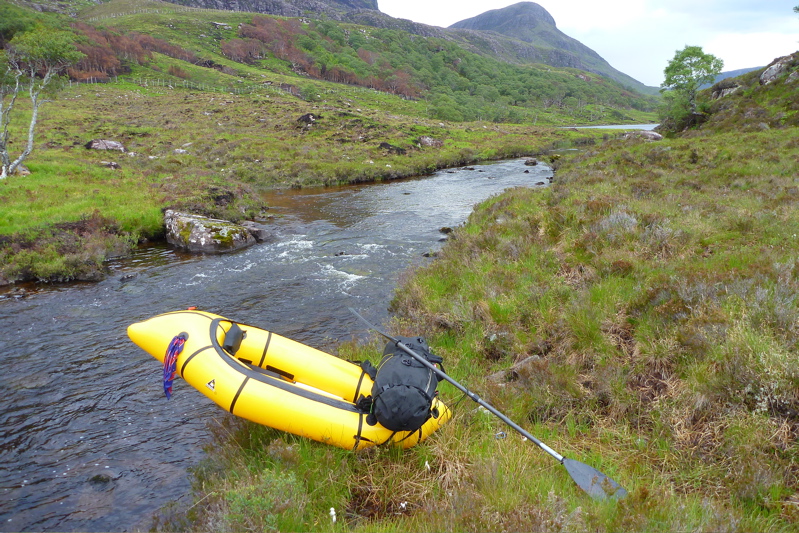 The channel that led west to Loch Sion (below Stac Polly, right) looked promising on the map, but even with the current high water levels following the deluge that was May, it soon got too shallow over the couple of metres drop to the next loch, and with a wince-inducing scrape the Yak hung up on a rock, requiring a short portage (left). That done, moving out onto Loch Sion a breeze was now in my face as I edged along the shore. Past Eilean Dubh I squeezed through another inter-island lead and out into the main loch, heading for Eilean Mor island. Even with the mild buffeting, it struck me how safe I felt alone in my raft; safer than I often feel initially in my Incept kayak at sea in similarly tame conditions. I think not being at sea had much to do with it, with no kind of wave or ill wind that could blow the Alpacka out to the wrong side of Greenland.
