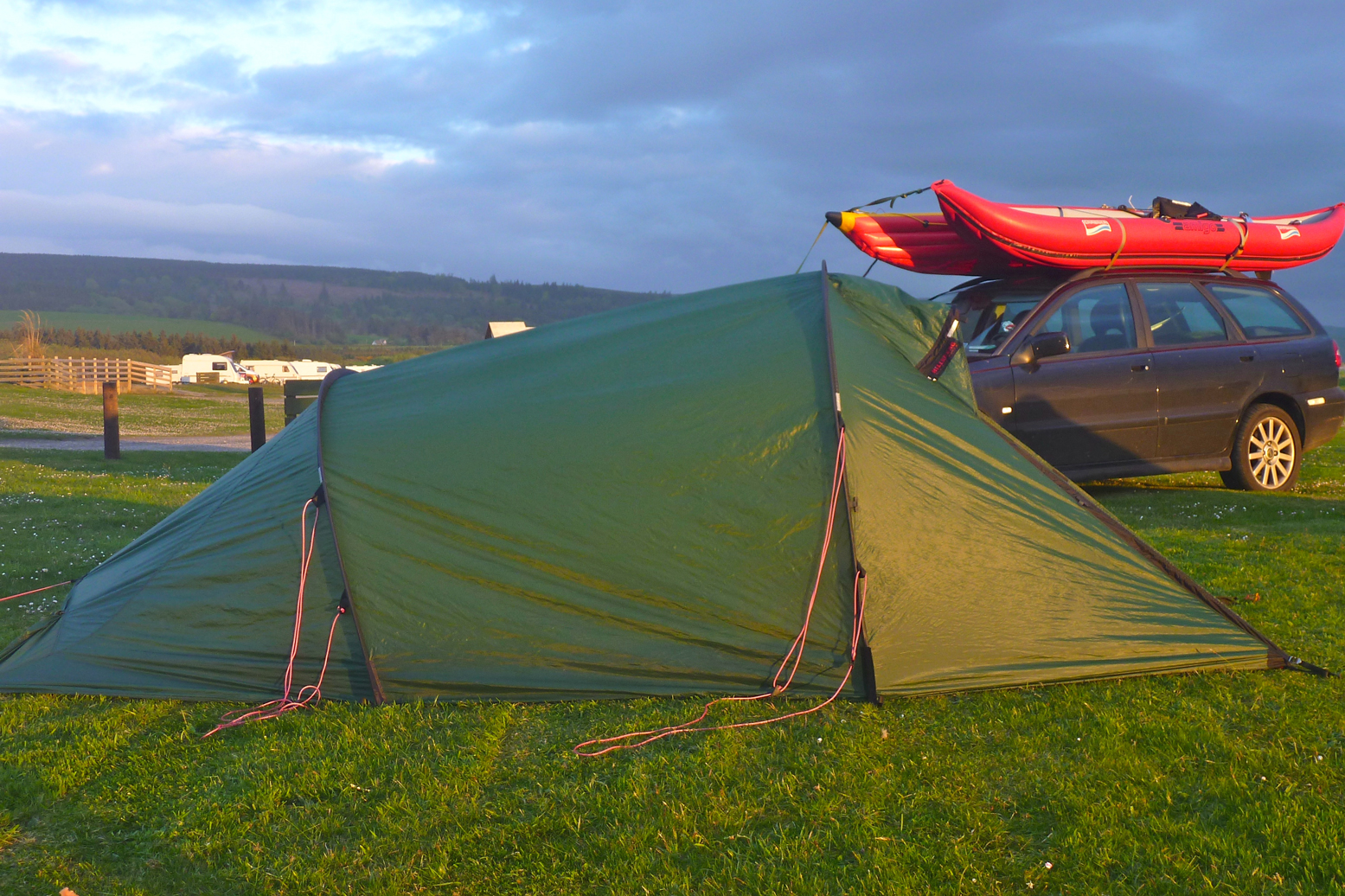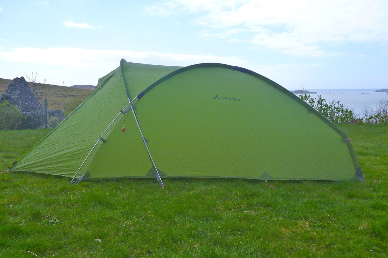 They say the Nallo-style tunnel design gives the lightest weight for volume. I’m not sure that’s true anymore, and those unsupported flanks make a racket plus inside, my Nallo was always a saggy affair (right), however I pitched it (left). While paddling the Slate Islands I took the chance to get some good ebay pics and sure enough, flogged it for more a little more than it cost me.