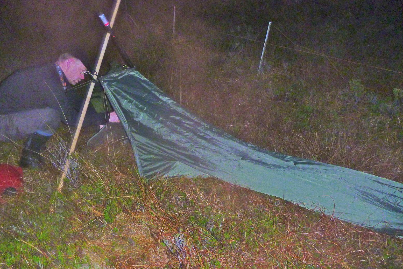 The Odyssee takes about ten minutes to pitch without hurrying and some faffing with the footprint (from the old Exped), and will stand with a minimum of two pegs staking out the porch. Two more at the back help make good tension, and using every dang loop and all six guys needs 16 pegs – you’re now ready for a gale and I suppose a pole will snap before it rips (there a pole repair sleeve included).