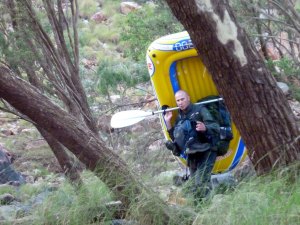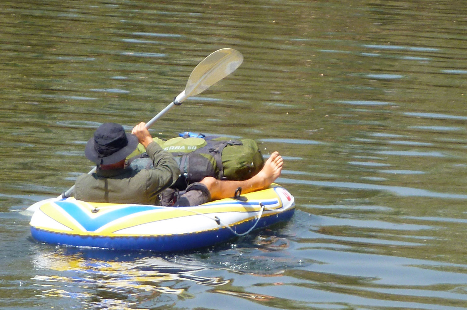 I expected to need to cover right up to reduce sun burn and transpiration: long trousers, long sleeves and a hat. But in the end while the UV was the same, it was not so hot on the river due to splashing and shade, and the trousers were only useful against big flies in the gorges on day one. The problem with long trousers is that when wet they cling to your legs and drag – Jeff eventually ripped his North Face zip-offs above the knee, but both if us turned to shorts and a bit of slip-slap-slop on our legs. Rolling up the trousers didn’t quite work.