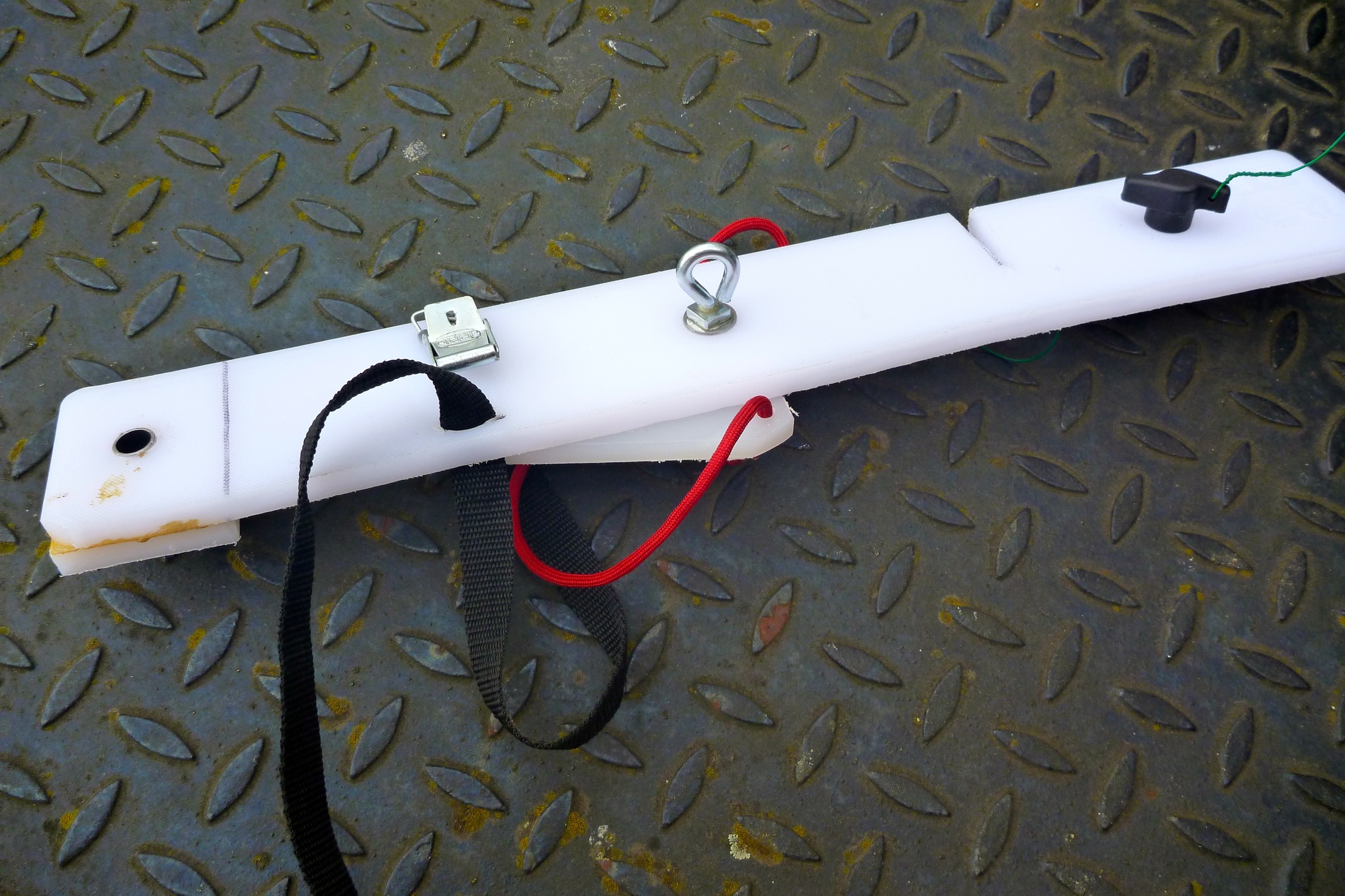I can’t really see how I could replicate that alloy footrest bar – out of copper tube filled with resin perhaps (like this motorbike rack)? It’s held securely in place without fittings by being jammed in the channel cavity between the floor and the sides (like my board), but a check with Gael advised me against it. As it happened, I’d pretty much decided the same mid-test run (below). A sliding ally bar plus seawater isn’t a great combination and might bend or break, or the pedals snap. I know the ally backrest bar on my Amigo wasn’t up to it and Gael’s backrest broke (though it was ancient). My plastic version may weigh double but should be solid. Interestingly, just as a bag of clam cleats turned up to make a quicker way of fine-tuning the rudder pedal lines from the cockpit, I see left that Grabner use them – a good sign.