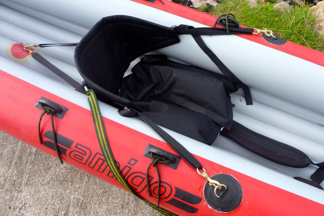 They have the usual removable and adjustable but rubbish seats which Gumotex is still famed for. I think it’s a way of getting through off-cuts of Nitrilon. For long trips I’d ditch them to save bulk, weight and inflation, and fit lighter and much a more supportive SoT backband + packraft seatbase (below left), as I’ve done to all my Gumos since my Grabner Amigo.