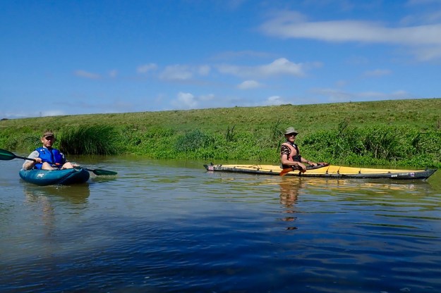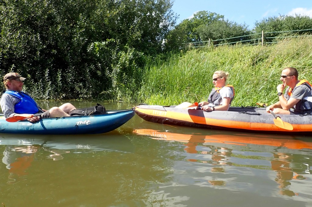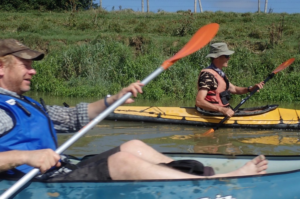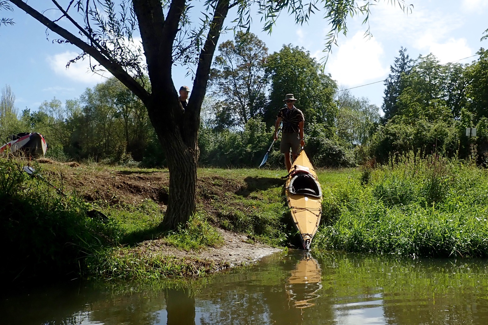 Yes it’s another tidal Sussex ditch with lots of day-amblers either side, but who can complain being on the water on a sunny day in a boat you brought in on your back and gangs of menacing swans to dodge? Robbo was spinning like a break-dancing turtle in his tiny Twist, Steve was piloting his old Feathercraft Kahuna, the folder nursing a broken plastic rib from last year’s Danube run. And E&L were in Rob’s dropstitch Yakkair which you can read about here.