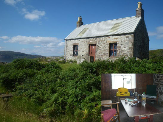 Day 2 – Uags to Red Point I woke up at dawn feeling numb as my old foam sleeping pad had been of little comfort on the floorboards. The temperature was 5°C; so much for this jet stream. I went out to stretch my body and surprised a little doe grazing in the meadow below the ruined Uags hamlet. It scampered away before I could fetch my camera (this is a double entrendre called ‘lacking reflex’). But – it had stopped raining, the air was clear and visibility was excellent. The snow-capped peaks of the Cuillins stood out beautifully against the sky (below left) but the chill air from the northeast soon sent me back inside.