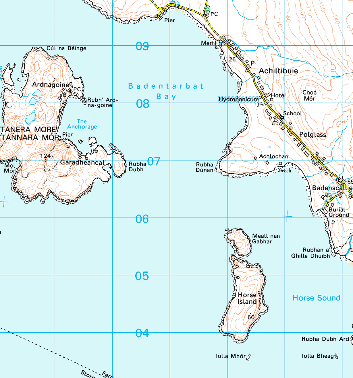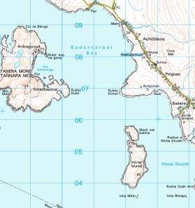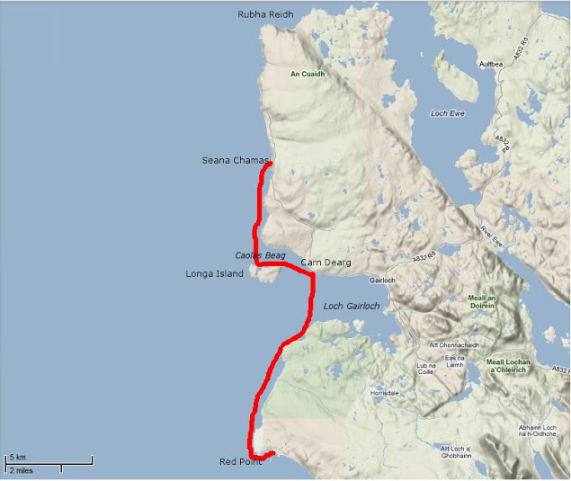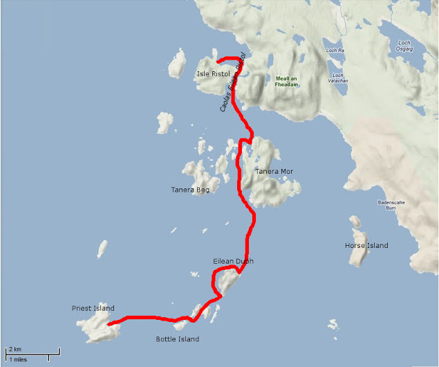Stuck out in outer Loch Broom, the little hoof-print shaped island of Carn nan Sgeir (above) lies midway between Horse Island and the Scoraig peninsula on the southern mainland. Some call it Bird Island and four times a day the CalMac ferry passes close by, sometimes to the north, sometimes to the south. Nearly a mile-and-a-half from land, I figured getting to Carn would be a good simulation of a more exposed run out to Priest Island (marked below). Plus on the sat image it looked like an unusual place, separated at all but the highest tides by a single, shingle isthmus.