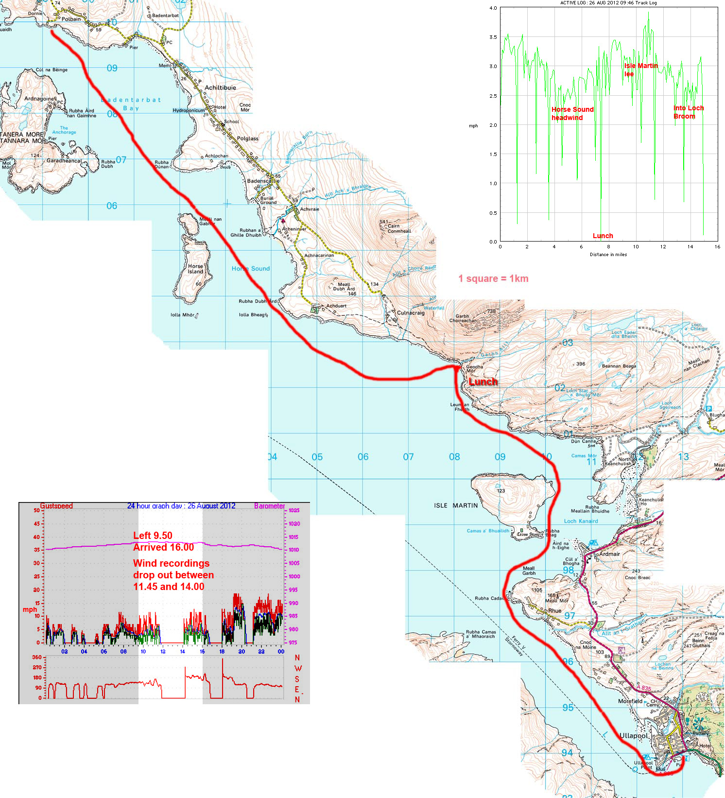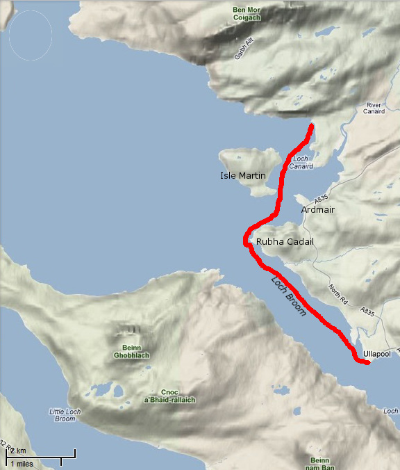 I shoved off shortly after lunch and enjoyed passing the last natural monuments of the Trail. I rounded Rubha Cadail, addressed the last salute to Ben Mor Coigach and entered Loch Broom. The wind unexpectedly veered NW and pushed me gently towards Ullapool.