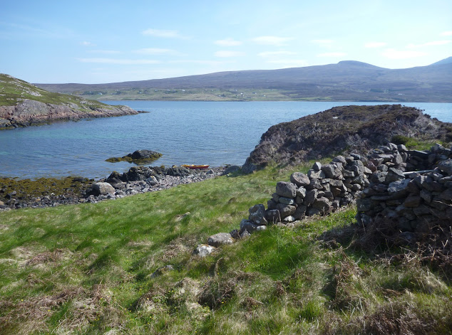 Getting to Carn’s high point took three minutes but doing so set off the dozing midges. As I reached the pole and rag marking the summit, the ferry was coming in from Stornaway, today passing south of the island. Midges made further exploration a misery, so I took a quick look at the grassier and less infested north isle then headed back to Badenscallie at a more relaxed pace. By now the wind had dropped right off and I stopped a few times to enjoy the silence, broken only by the splash of a seal or a distant guillemot flapping off the water. I couldn’t get over it, there seemed something uncanny about how well the boat was tracking, perhaps I’d not yet paddled in such a calm. As a test I closed my eyes and paddled on for a minute; two times out of three I remained bang on target for the beach – the other time I was off at 90 degrees. As I neared the beach a light north breeze started up, just as predicted, and in a couple of hours the sun would emerge below the cloud ceiling’s western edge to make for another sunny evening. As I’d found a few weeks ago when I paddled to Lochinver, and then around Rubha Coigach, when it’s calm up here you feel you can almost walk across the water to anywhere you like.