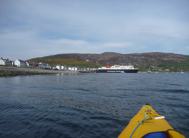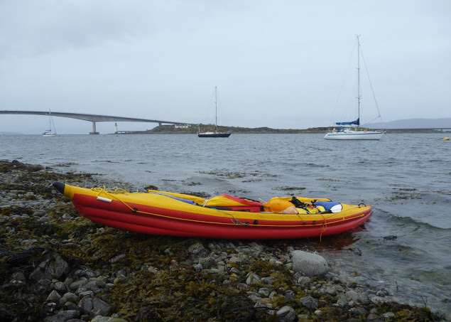 Day 1 – Kyleakin to Uags The trip began rather badly. I arrived around midnight in Kyleakin after an interminable drive from Paris with an exhausting final crossing through the Highlands mostly in the rain. I set up my tent quickly on the grass by the hostel’s backyard. Once in my sleeping bag, I fell asleep right away, lulled by the pounding of rain on the canvas and the rustle of leaves in the wind gusts. Early next morning I woke up with my feet feeling cold and wet; during my deep slumber I’d pushed them under the edge of the tent. Fortunately, my sleeping bag fill is synthetic and the nylon shell water repellent enough and with relief I found it was still dry inside. The ground all around was drenched and I could now test the effectiveness of my new Seal Skinz socks. It was still raining, so I donned my foul weather gear right away before proceeding with the usual pre-launch routine (inflate kayak, rig the accessories, sort food and equipment before closing the bags). Like last year I went to Kyle of Lochalsh Police Station to report my departure, then to the Co-op to stock up on McEwans in case I got shipwrecked.