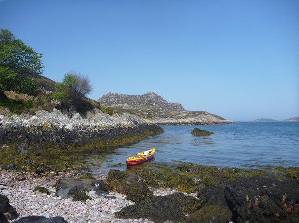 Who knows, but it was nice to be able to walk around, rather than teether on acute, barnacle-covered slabs, as I’d just done on Angus. We settled down out of the breeze – May temperatures are still barely in double figures up here – and unpacked our munchies. We had with less than an hour before the tide turned and lifted the Gumotex away. As we ate we spotted another couple of paddlers enjoying the calm conditions out to the southeast, near the two Carns which join up at low tides, like today. Though you’re not spoilt for choice out here in the Summer Isles, you could easily camp on Sgeir an Aon Iomairt. There’s brackish water in some pools, good enough for a wash, and enough flat patches to sleep in comfort. Hardshell or IK, for peace of mind you’d still want to lug you’re boat above the high water line unless you can find a bombproof anchorage. And the elevation of around 16m is, you’ll be pleased to know, about right. When our time came the tide had dropped a metre but was on the turn. Getting back in was as always an awkward shunt, slipping around on kelp and slimey molluscs to get the Seawave back on the water, but once in the pool it did manage to paddle itself out over the slimy kelp towards Sgeir Ribhinn (‘Maiden’s Skerry’), the last of our Summer Island skerries.