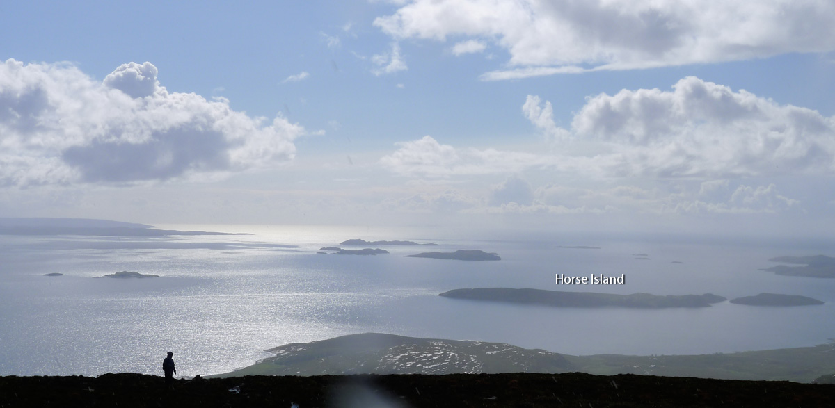We mucked around alongside the surf breaking over the skerry of Iolla Mor and eyed up Carn nan Sgeir, some 2km away. We could make a run and probably make it, or we could play it safe. With the forecast set to worsen, we settled for a loop round Iolla, scattering some seals, then dithered again over making a break for Carn. Discretion prevailed again, so instead we landed on Horse Island and hacked through the chest-high bracken to the 60-metre summit cairn. As the disturbed birds wheeled over our heads, we looked over to isolated horseshoe of Carn and the thick clouds swathing the Torridons beyond.