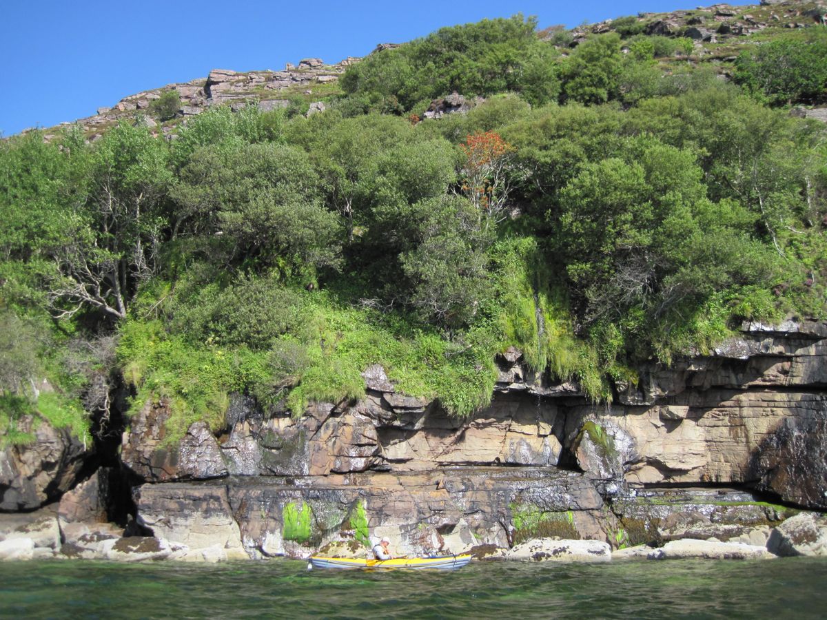 The sky became overcast and the NE wind picked up as I approached Loch Gairloch. The temperature dropped rapidly and I paddled more vigorously towards Carn Deag in an attempt to stay warm. I made a brief stop on the beach at Big Sand (left) but the chill breeze urged me on. I passed downwind along Longa Island with the hope of discovering a sheltered cove for lunch but found none. I then went on across Caol Beag, passed Rubha Ban and kept paddling north with my stomach gurgling. The beauty of the coast was worth the inconvenience of being cold, numb and hungry; huge sections of sandstone cliffs that had fallen in the sea provided an extraordinary maze of narrow passages that I enjoyed threading through. Erosion had also cut multiple geos and caves also worth exploring (I didn’t know what a geo was before reading the SSKT guidebook). I eventually reached Seana Chamas beach, largely uncovered by the outgoing tide and where I landed and dragged my kayak a few yards on a carpet of seaweed.