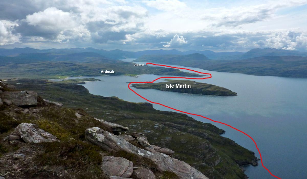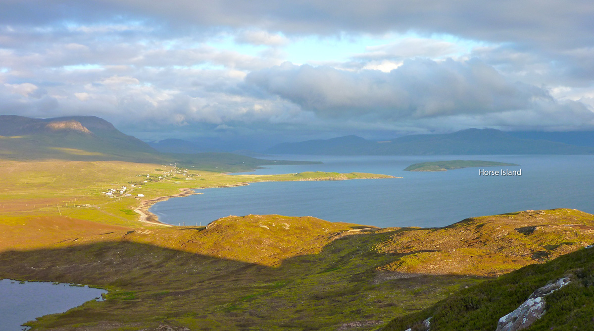 It was the same deal last weekend, but midweek the winds dropped and so did the pressure of finishing the current job. So I slipped out one evening across Badentarbet Bay to try and thread a loop through Horse Island. Not having paddled for weeks, as usual I went through the usual neuroses as I parted with the shore (“Crikey, this water really looks dark and deep”. “I really must take a spare paddle.” etc, etc…) while cautiously tracking some low cloud or mist coming up with a southern breeze. Horse Island is actually further than it looks, about 5km from the pier, and once I decided I’d survive the crossing I planned to slip through the gap between Meall nan Gabhar (see map, above) and head back. The passage is no longer pictured right by Gael who passed that way a couple of months back in his Incept at the culmination of his epic run up the Scottish Sea Kayak Trail.