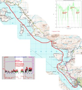 Another calm day, another island paddled around; a quick one to Horse Island which I visited last year. On that occasion the two islands of Horse and the smaller Meall nan Gabhar were separated by a stony, seaweed-drapped causeway. Today, leaving Badentarbet beach 40 minutes after HW, I expected to paddle between the two. On the way out I noticed that the way I’d clipped the new backrest was not so good, so at Runha Dunan point (map left) I pulled over to try something less bad (right). I definitely need to come up with something better, and for the rest of the trip avoided leaning against the strap for fear of damaging the lugs. That may have contributed to the fatigue, if not actual low speeds (see below). Expensive but stout Grabner D-rings and an SoT backrest are on the way. At 2.7 miles out a wide channel separated Horse from its northern neighbour (left). In the absence of distracting wind and at today’s tide (3.6m, max can be 4.7) I wanted to see if I could detect any currents in places like this channel. Maybe not yet only 1.5 hours after HW, but by the time I closed the loop a flow – I imagined against me from east to west – ought to be noticeable. Down the inland side of the Horse I passed the small seal colony (left) we spotted on our way to Ullapool last year. And at around 70 minutes and 4 miles out I turned around the south end of Horse Island (left) and experienced the slight turbulence I expected, possibly as the tide flowed round the point against a rising southwest breeze. Up the outside of the Island I felt a bit exposed so pressed on against the chop and as I returned to the gap from the south side the back end of the kayak kicked out a bit. A ha, something’s happening two hours after high water, getting through the gap may be a struggle. I felt the nose of the boat pull off course unless I kept straight on against an imagined current. But as the speed graph shows, I was actually going faster than an hour 20 minutes earlier and the seaweed below wasn’t showing any signs of flow, so if anything it was a light current pushing the back around. All very confusing. Perhaps the ebbing tide backing out of Loch Broom around the island creates a back eddy through Horse Channel. The fifty-minute paddle back to the beach turned into quite a haul, but that’s the way I like it sometimes and somewhere on this stage the GPS’s trip log (if not the track log, left) recorded the magical 5 mph! All up, 8.1 miles in 2 hours 20 at a moving average of 3.5 mph. About 10% faster than my other solo trips over the last week to Lochinver and around Rubha Coigach, but as a training run and without a proper back rest, the effort wore me out. As for tides and tidal movements, for the moment I remain baffled.