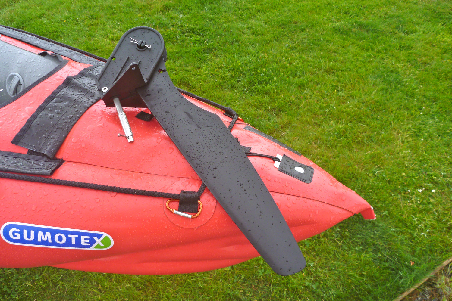 On the beach, prior to lugging the boat over seaweed-clad boulders, it took only 30 seconds to unclip the rudder mechanism from the plate to pre-empt stumbling and damaging it. Since then I changed the rudder plate mounts with tool-free knobs and an eyelet (above). When rolling the boat up it was best to pivot the rudder plate around the drain hole 90° to pack better.