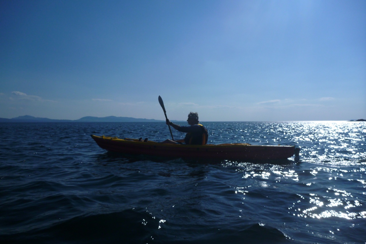 Finally we turned downwind, portaged the sandy isthmus at Eilean Garbh and moved on to the next sandy beach for a long lunch break and what had become my customary doze. Out on the northwest horizon pale blue humps marked the Paps of Jura. I read this short book partly about Jura recently (no so satisfying); among the Inner Hebrides Jura seems to have a certain allure.