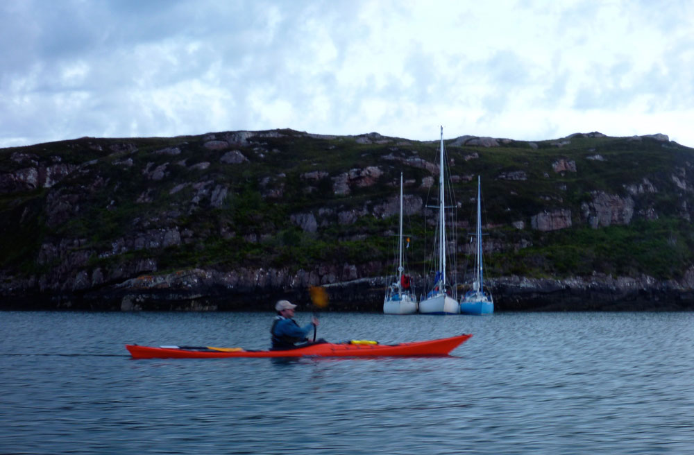 The Sound of Sleat off Kyleakin (left) was calm enough, but out beyond the bridge the sea had a bit of a head on it. We had a 1970s-era lunch, Gael checked out with the police in Lochalsh and decided to hang out up here on the off chance the weather improved and he or we could make a little tour of the Summer Isles. He was also keen to try out my Incept as his Grabner was showing the years. In fact is was he who last year pointed out that Incept K40 had evolved since I last checked it out. For me it was also a good chance to interrogate an experienced sea kayaker about the Ways of the Sea. Among the many skills I feel I lack is the judgement to know when it’s safe to got out and when I ought to turn back: interpreting clouds and wind changes, forecasts and sea states. It’s a lot of stuff to understand so we spent Friday chatting while refreshing various forecast websites: Saturday looked like a bit of a lull so Jon came up to for a paddling threesome.