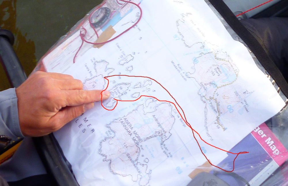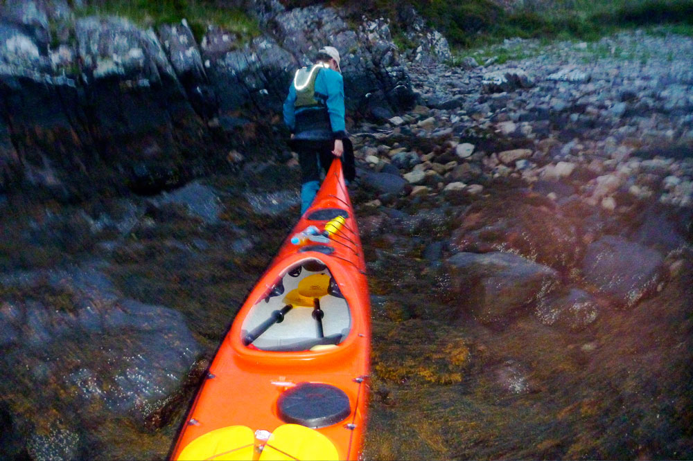 It was the same deal last weekend, but midweek the winds dropped and so did the pressure of finishing the current job. So I slipped out one evening across Badentarbet Bay to try and thread a loop through Horse Island. Not having paddled for weeks, as usual I went through the usual neuroses as I parted with the shore (“Crikey, this water really looks dark and deep”. “I really must take a spare paddle.” etc, etc…) while cautiously tracking some low cloud or mist coming up with a southern breeze. Horse Island is actually further than it looks, about 5km from the pier, and once I decided I’d survive the crossing I planned to slip through the gap between Meall nan Gabhar (see map, above) and head back. The passage is no longer pictured right by Gael who passed that way a couple of months back in his Incept at the culmination of his epic run up the Scottish Sea Kayak Trail.