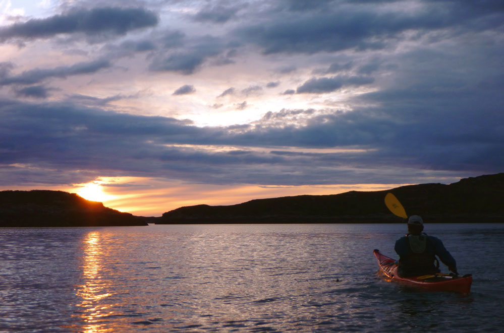 Friday night Jon and I paddled over to the Summer Isles on an exceedingly calm evening. After a bit of dithering looking for a place to camp, we hacked through the seaweed to get onto Tanera Beag about 11pm where we set up for the night. As predicted, it got windy and flapping tents meant we didn’t get much sleep, although at one point a sudden lull at 3.30am did wake me up with a start. Out over Polbain the red sky was already presaging the dawn, just 80 degrees east from where the sun had set 5 hours earlier. Heading back later that morning into an F4, it was nice when that part was nearly over. Near the each I hooked around the and tried a bit of disc sailing – it works but I definitely need a bigger sail. A few days late but I got my midsummer’s mini adventure after all.