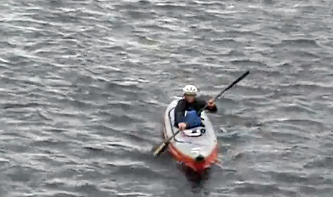 The hull is composed of three I-beamed chambers with twin-beam sides to help give its 14 feet better rigidity. The Sunny had round, single chamber sides which, although they get nice and taut on a hot day, the boat still flexes with the swell or even just with my weight in it. With I-beam chambers the K40 features pressure-relief valves on all three chambers including the sides rated at 5psi which are out of the water. This reduces the strain on the welded I-beam seams but it’s possible that some air will be purged through the valves as it expands in the course of a hot day. For this reason I see that Incept recommends carrying a small, top-up pump (right) as can be seen on the deck of the kayak pictured above. With it, you can re-pressurise the boat for maximum performance, and this can be done on the move as the valves (grey) are right there in the cockpit (the sidewall PRVs are behind the seat). The twin beams also add up to less width (69cm or 27 inches – 3-4 inches less than my Sunny) and so more speed – although re-entry may be harder and all without – I hope – making it too tippy. It’s got a rudder because those high sides may catch a crosswind at times. Scoffed at by Brit sea kayakers who use boats that have hull profiles designed to turn when leaning out (very odd if you’re a motorbiker!), with a rudder you can paddle normally across the wind and use the rudder to correct the tracking.